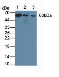 - Western Blot; Sample: Lane1: Human Lung Tissue; Lane2: Human A-431 Cells; Lane3: Rat Skin Tissue.