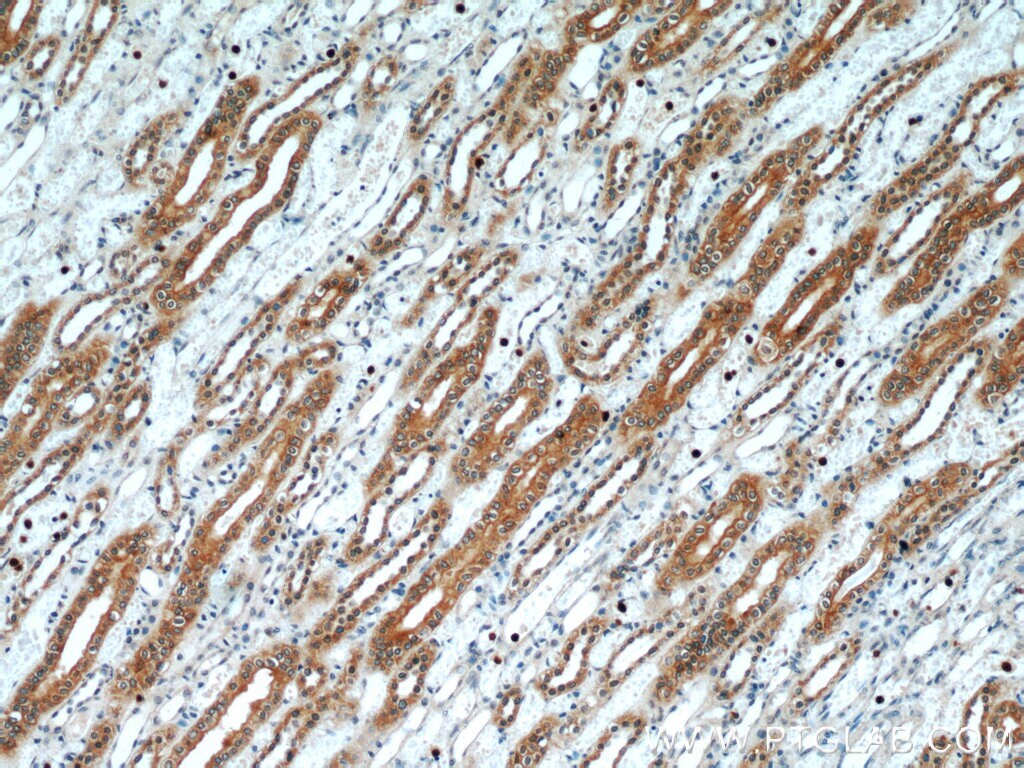 - Immunohistochemistry of paraffin-embedded human kidney using 55212-1-AP (PLS1 antibody) at dilution of 1:50 (under 40x lens).