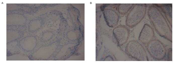 - Immunohistochemistry analysis of rat testis tissue using PDE10A Polyclonal Antibody (Product # PA1-31145). Figure A: Negative control. Figure B: Primary antibody. Dilution: 1:200.