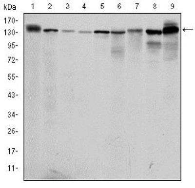 - Western Blot: PKN2 Antibody (1D1) [NBP2-37573] - Western blot analysis using PRK2 mouse mAb against PC-12 (1), Cos7 (2), K562 (3), Jurkat (4), Hela (5), A431 (6), C6 (7), NIH/3T3 (8) and HEK293 (9) cell lysate.