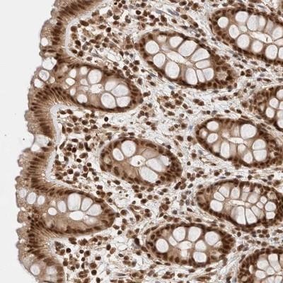 - Immunohistochemistry-Paraffin: KIAA1107 Antibody [NBP1-87546] - Staining of human rectum shows strong nuclear positivity in glandular cells.