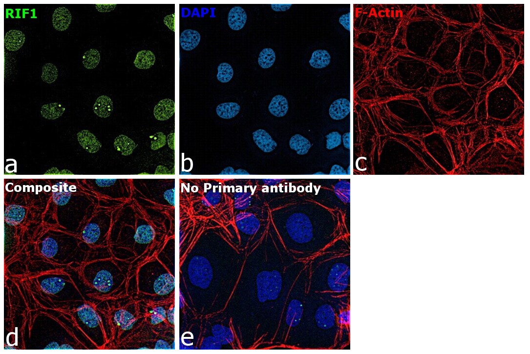 - Immunofluorescence analysis of Telomere-associated protein RIF1 was performed using 70% confluent log phase NIH:OVCAR-3 cells. The cells were fixed with 4% paraformaldehyde for 10 minutes, permeabilized with 0.1% Triton™ X-100 for 15 minutes, and blocked with 2% BSA for 45 minutes at room temperature. The cells were labeled with RIF1 Polyclonal Antibody (Product # PA5-78523) at 1:200 in 0.1% BSA, incubated at 4 degree celsius overnight and then labeled with Donkey anti-Rabbit IgG (H+L) Highly Cross-Adsorbed Secondary Antibody, Alexa Fluor Plus 488 (Product # A32790), (1:2000), for 45 minutes at room temperature (Panel a: Green). Nuclei (Panel b:Blue) were stained with ProLong™ Diamond Antifade Mountant with DAPI (Product # P36962). F-actin (Panel c: Red) was stained with Rhodamine Phalloidin (Product # R415, 1:300). Panel d represents the merged image showing Nuclear localization. Panel e represents control cells with no primary antibody to assess background. The images were captured at 60X magnification.