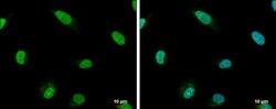 - RIF1 Polyclonal Antibody detects Rif1 protein at nucleus by immunofluorescent analysis. Sample: HeLa cells were fixed in 4% paraformaldehyde at RT for 15 min. Green: Rif1 protein stained by RIF1 Polyclonal Antibody (Product # PA5-78523) diluted at 1:500. Blue: Hoechst 33342 staining. Scale bar = 10 µm.