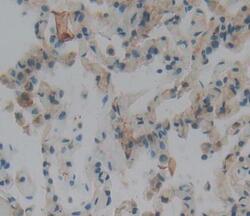 - Immunohistochemistry of OLFM3 in paraffin-embedded lung tissue. Samples were incubated in polyclonal OLFM3 antibody (Product # PA5-121726) followed by DAB.
