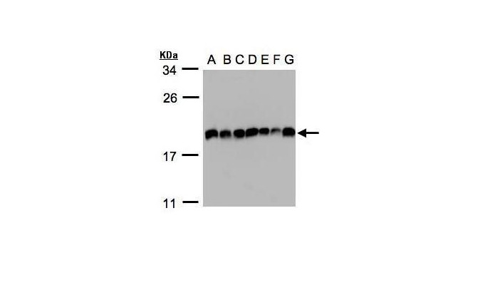 - Sample(30?g of whole cell lysate)A: 293TB: A431 C: H1299D: HeLa S3 E: Hep G2 F: MOLT4 G: Raji 15% SDS PAGEOAGA00855 diluted at 1:1000