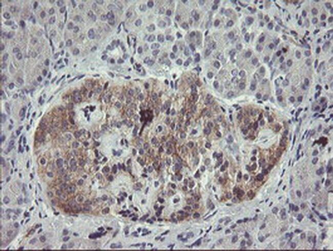 - Immunohistochemical staining of paraffin-embedded human pancreas tissue within the normal limits using anti-EIF5A2 mouse monoclonal antibody. (Heat-induced epitope retrieval by 10mM citric buffer, pH6.0, 100°C for 10min, TA505100)