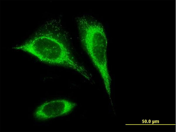 - Immunofluorescence of purified MaxPab antibody to SLC25A24 on HeLa cell. [antibody concentration 10 ug/ml]
