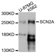 - Western blot analysis of extracts of various cell lines, using SCN2A antibody at 1:1000 dilution. The secondary antibody used was an HRP Goat Anti-Rabbit IgG (H+L) at 1:10000 dilution. Lysates were loaded 25ug per lane and 3% nonfat dry milk in TBST was used for blocking. An ECL Kit was used for detection and the exposure time was 5s.