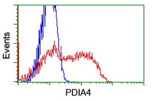 - HEK293T cells transfected with either RC204041 overexpress plasmid(Red) or empty vector control plasmid(Blue) were immunostained by anti-PDIA4 antibody(TA503904), and then analyzed by flow cytometry.
