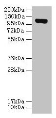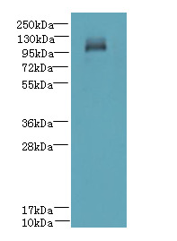 - Western blot. All lanes: DENND2C antibody at 8 ug/ml+A40- whole cell lysate Goat polyclonal to rabbit at 1:10000 dilution. Predicted band size: 107 kDa. Observed band size: 107 kDa.