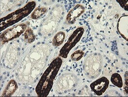 - Immunohistochemical staining of paraffin-embedded human Kidney tissue within the normal limits using anti-TRIM45 mouse monoclonal antibody. (Heat-induced epitope retrieval by 10mM citric buffer, pH6.0, 120°C for 3min, TA505922)