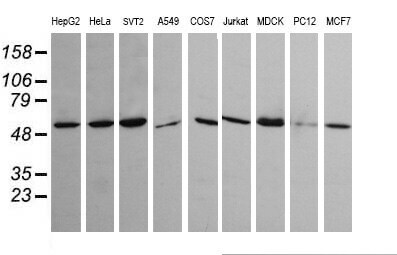 - Western blot analysis of extracts (35 µg) from 9 different cell lines by using anti-TRIM45 monoclonal antibody (HepG2: human; HeLa: human; SVT2: mouse; A549: human; COS7: monkey; Jurkat: human; MDCK: canine; PC12: rat; MCF7: human).