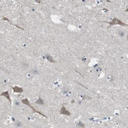- Immunohistochemical staining of human cerebral cortex shows cytoplasmic positivity in neuronal cells.