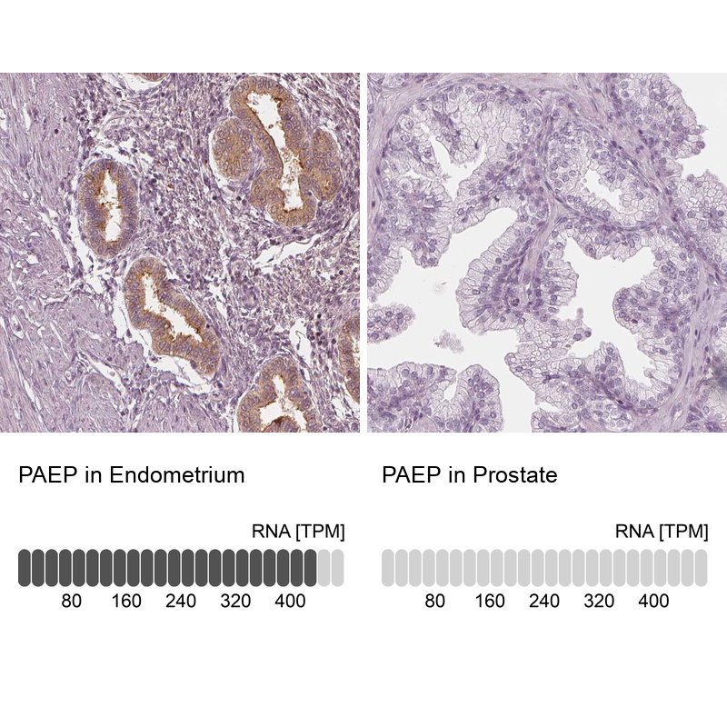 - Immunohistochemistry analysis in human endometrium and prostate tissues using HPA020108 antibody. Corresponding PAEP RNA-seq data are presented for the same tissues.