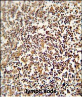 - Immunohistochemistry analysis of LRRC33 in formalin fixed and paraffin embedded human lymph node. Samples were incubated with LRRC33 polyclonal antibody (Product # PA5-23822) followed by peroxidase conjugation of the secondary antibody and DAB staining. This data demonstrates the use of this antibody for immunohistochemistry. Clinical relevance has not been evaluated.