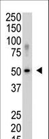 - Western blot of SENP5 polyclonal antibody in Saos-2 cell lysate. SENP5 (Arrow) was detected using purified antibody. Secondary HRP-anti-rabbit was used for signal visualization with chemiluminescence.