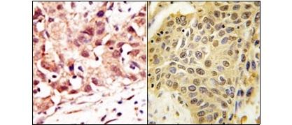 - (LEFT) Formalin-fixed and paraffin-embedded human cancer tissue reacted with the primary antibody, which was peroxidase-conjugated to the secondary antibody, followed by DAB staining. This data demonstrates the use of this antibody for immunohistochemistry; clinical relevance has not been evaluated. (RIGHT) Formalin-fixed and paraffin-embedded human lung carcinoma tissue reacted with SENP5 Antibody (C-term) (Cat.#AP11240PU-N), which was peroxidase-conjugated to the secondary antibody, followed by DAB staining. This data demonstrates the use of this antibody for immunohistochemistry; clinical relevance has not been evaluated.