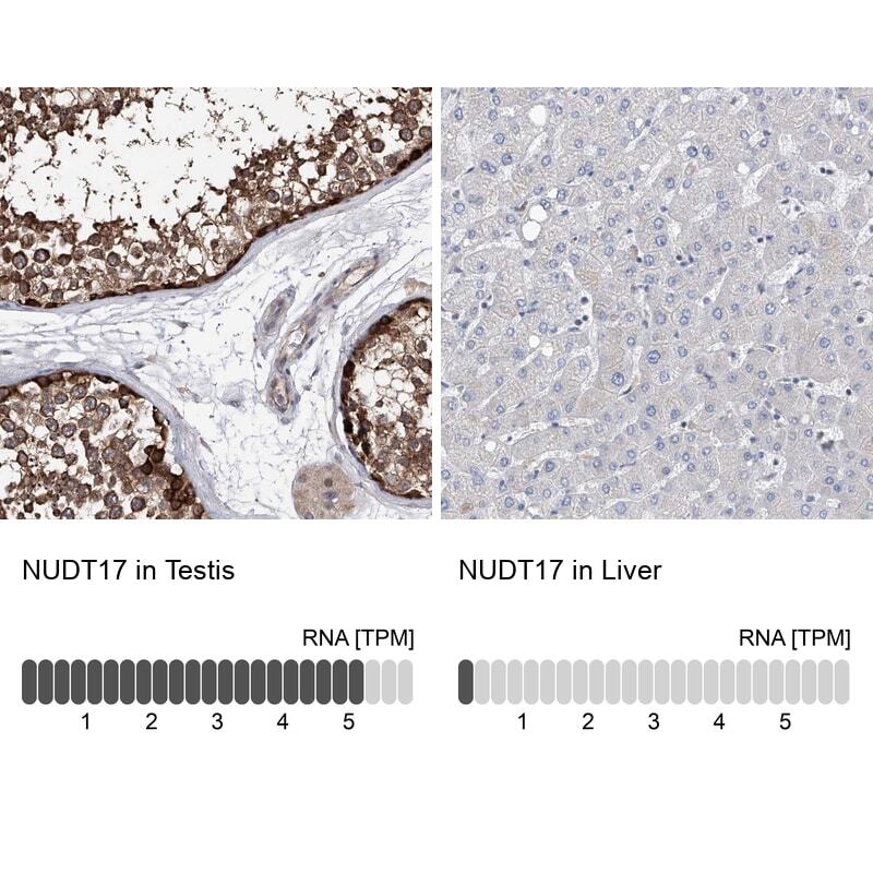 - Immunohistochemical staining of NUDT17 in human testis and liver tissues using NUDT17 Polyclonal Antibody (Product # PA5-56365). Corresponding NUDT17 RNA-seq data are presented for the same tissues.
