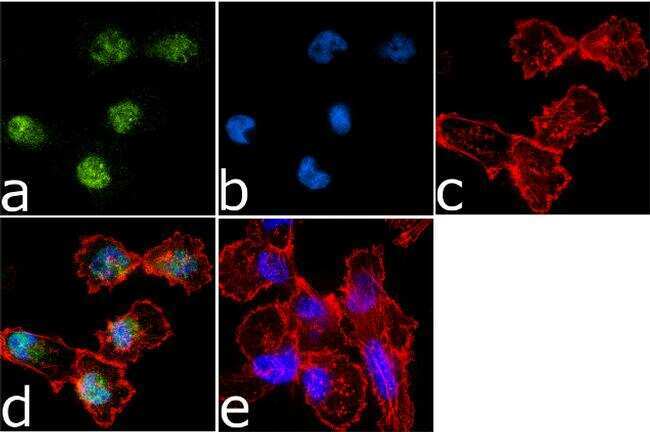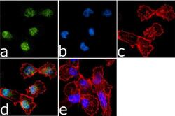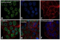 - Immunofluorescence analysis of AMPKA (pThr183, Thr172) was done on 70% confluent log phase MDA-MB-231 cells. The cells were fixed with 4% paraformaldehyde for 15 minutes, permeabilized with 0.25% Triton™ X-100 for 10 minutes, and blocked with 5% BSA for 1 hour at room temperature. The cells were labeled with Phospho-AMPK alpha-1,2 (Thr183, Thr172) (10H2L20) Recombinant Rabbit Monoclonal Antibody (Product # 701068) at 1 µg/mL in 1% BSA and incubated for 3 hours at room temperature and then labeled with Goat anti-Rabbit IgG (Heavy Chain) Superclonal™ Secondary Antibody, Alexa Fluor® 488 conjugate (Product # A27034) at a dilution of 1:2000 for 45 minutes at room temperature (Panel a: green). Nuclei (Panel b: blue) were stained with SlowFade® Gold Antifade Mountant with DAPI (Product # S36938). F-actin (Panel c: red) was stained with Alexa Fluor® 555 Rhodamine Phalloidin (Product # R415, 1:300). Panel d is a merged image showing Nuclear localization. Panel e is a no primary antibody control. The images were captured at 60X magnification.