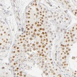 - Immunohistochemical staining of human testis shows moderate nuclear positivity in cells in seminiferus ducts.