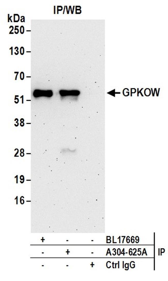 - Detection of human GPKOW by western blot of immunoprecipitates. Samples: Whole cell lysate (0.5 or 1.0 mg per IP reaction; 20% of IP loaded) from 293T cells prepared using NETN lysis buffer. Antibodies: Affinity purified rabbit anti-GPKOW antibody A304-625A (lot A304-625A-1) used for IP at 6 µg per reaction. GPKOW was also immunoprecipitated by rabbit anti-GPKOW antibody BL17669. For blotting immunoprecipitated GPKOW, A304-625A was used at 0.4 µg/ml. Detection: Chemiluminescence with an exposure time of 3 minutes.