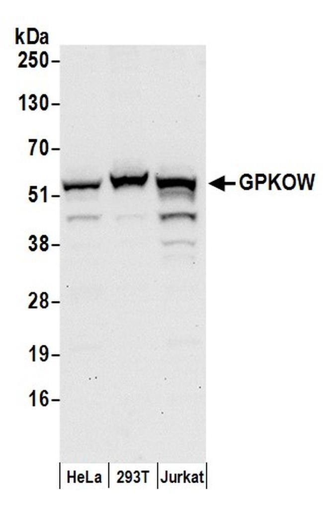 - Detection of human GPKOW by western blot. Samples: Whole cell lysate (50 µg) from HeLa, 293T, and Jurkat cells prepared using NETN lysis buffer. Antibodies: Affinity purified rabbit anti-GPKOW antibody A304-625A (lot A304-625A-1) used for WB at 0.4 µg/ml. Detection: Chemiluminescence with an exposure time of 30 seconds.