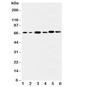 - Western blot testing of AKT3 antibody and Lane 1: rat lung; 2: (r) kidney; 3: human HeLa; 4: (h) placenta; 5: (h) A549; 6: mouse NIH3T3 cell lysate. Expected/observed size 56~70KD