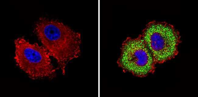 - Immunofluorescent analysis of Insulin Receptor beta (green) showing staining in the cytoplasm of Hela cells (right) compared to a negative control without primary antibody (left). Formalin-fixed cells were permeabilized with 0.1% Triton X-100 in TBS for 5-10 minutes and blocked with 3% BSA-PBS for 30 minutes at room temperature. Cells were probed with an Insulin Receptor beta monoclonal antibody (Product # MA5-13778) in 3% BSA-PBS at a dilution of 1:20 and incubated overnight at 4 ºC in a humidified chamber. Cells were washed with PBST and incubated with a DyLight-conjugated secondary antibody in PBS at room temperature in the dark. F-actin (red) was stained with a fluorescent red phalloidin and nuclei (blue) were stained with Hoechst or DAPI. Images were taken at a magnification of 60x.