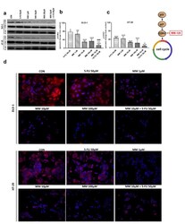 - Figure 8 Phosphorylated CDK2 (p-CDK2), total CDK2 (t-CDK2), and beta-actin expression as determined by Western blot ( a ) and phosphorylated CDK2 (p-CDK2) determined by confocal microscopy ( d ) in DLD-1 and HT-29 cells treated with 5-FU (5-FU 50 uM), MM-129 (MM 1 uM, 10 uM, 100 uM), and their combination (MM 10 uM + 5-FU 50 uM) for 24 h. The samples used for electrophoresis consisted of 20 ug of protein from 6 pooled cell extracts from independent experiments ( n = 6). Band staining was quantified by densitometry ( b , c ). The corresponding uncropped blots are shown in Supplementary Figures S9a-c and S10a-c . Cells were incubated with rabbit polyclonal antibody against phospho CDK2 and secondary goat polyclonal antibody against rabbit (red label). The nuclei were stained with Hoechst 33342 (blue label) ( d ). The results are presented as means +- SDs. * p < 0.05, ** p < 0.01, *** p < 0.001 vs. CON, ^^ p < 0.01 vs. 5-FU, ^^^ p < 0.001 vs. 5-FU, ### p < 0.001 vs. MM-129 at dose 10 uM.