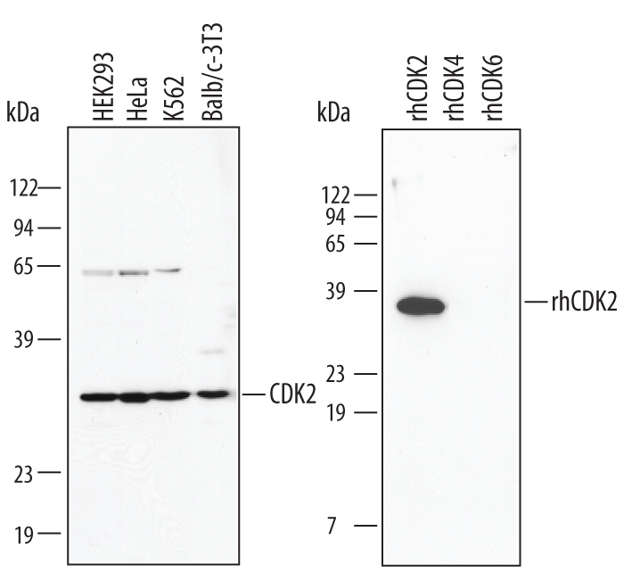 - Detection of Human/Mouse CDK2 by Western Blot. Western blot shows lysates of HEK293 human embryonic kidney cell line, HeLa human cervical epithelial carcinoma cell line, K562 human chronic myelogenous leukemia cell line, and Balb/3T3 mouse embryonic fibroblast cell line. PVDF membrane was probed with 1 µg/mL Goat Anti-Human/Mouse CDK2 Antigen Affinity-purified Polyclonal Antibody (Catalog # AF4654) followed by HRP-conjugated Anti-Goat IgG Secondary Antibody (Catalog # HAF017). For additional reference, recombinant human CDK2, CDK4, and CDK6 (5 ng/lane) were included. A specific band for CDK2 was detected at approximately 34 kDa (as indicated). This experiment was conducted under reducing conditions and using Immunoblot Buffer Group 1.
