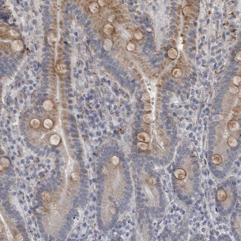 - Immunohistochemical analysis of LYSMD1 in human upper dodenum using LYSMD1 Polyclonal Antibody (Product # PA5-55755) shows weak cytoplasmic positivity in glandular cells.