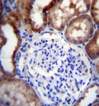 - Immunohistochemistry analysis in formalin fixed and paraffin embedded human kidney tissue reacted with LINGO4 Antibody (C-term) ??followed by peroxidase conjugation of the secondary antibody and DAB staining.