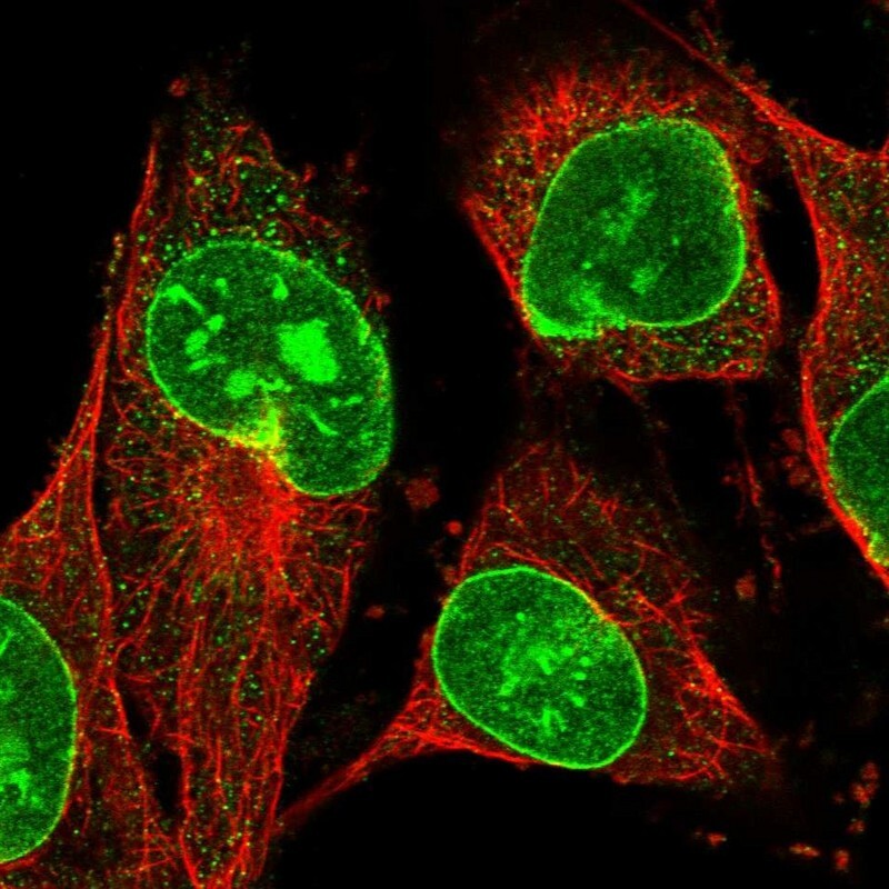 - Immunofluorescent staining of human cell line U-251 MG shows localization to nucleoli & nuclear membrane.