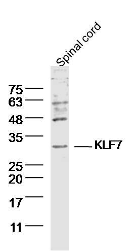 - Mouse Spinal cord lysates probed with KLF7 Polyclonal Antibody, Unconjugated (bs-11865R) at 1:300 dilution and 4°C overnight incubation. Followed by conjugated secondary antibody incubation at 1:10000 for 60 min at 37°C.