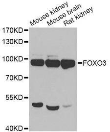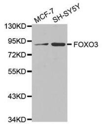 - Western blot analysis of extracts of various cell lines, using FOXO3 antibody at 1:1000 dilution. The secondary antibody used was an HRP Goat Anti-Rabbit IgG (H+L) at 1:10000 dilution. Lysates were loaded 25ug per lane and 3% nonfat dry milk in TBST was used for blocking. An ECL Kit was used for detection and the exposure time was 60s.