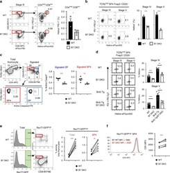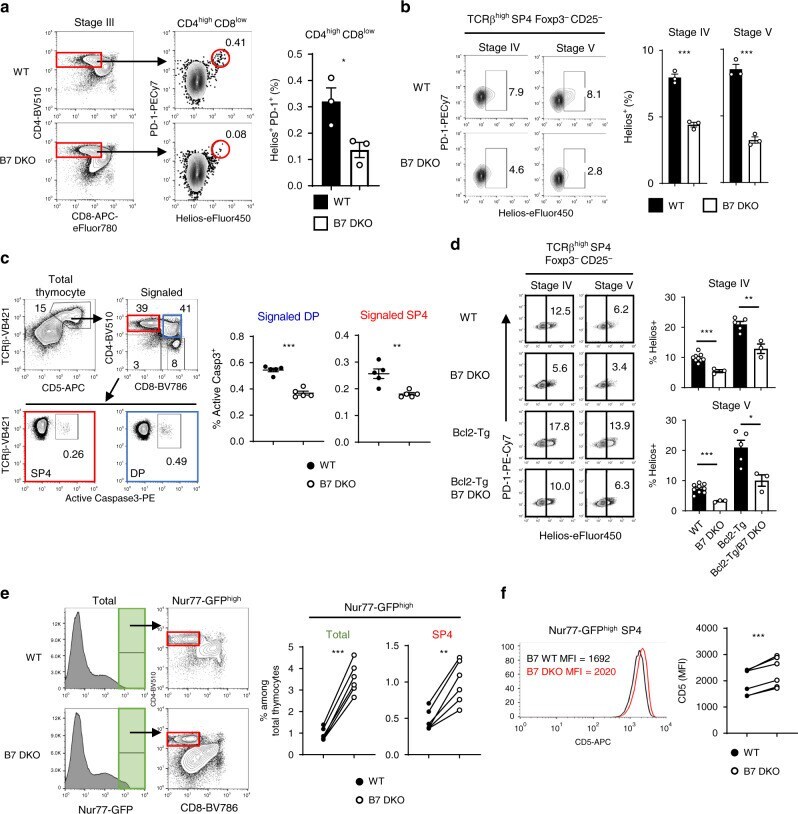 - Fig. 2 In the absence of B7-CD28 co-stimulation, the frequency of cells undergoing clonal deletion at DP and CD4SP stages is decreased. a - d WT and B7 DKO thymocytes were gated on developmental stages as defined by TCR and CD69 expression in Fig. 1 . a Frequency of clonally deleting cells (Helios + PD-1 high ) was decreased in Stage III (CD4 + CD8 low ) thymocytes in B7 DKO mice. Each group n = 3. Data are representative of three independent experiments. p = 0.0365. b Frequency of clonally deleting cells (Helios + ) was decreased in Stage IV and V SP4 Tconv (CD25/Foxp3 nega ) in B7 DKO mice. Each group n = 3. Data are representative of three independent experiments. Stage IV p = 0.0004, Stage V p = 0.0003. c Frequency of clonally deleting cells (Active Caspase3 + ) was decreased in TCR-signaled DP and SP cells in B7 DKO mice. Each group n = 5. Data are pooled results of two independent experiments. Signaled DP p < 0.0001, Signaled SP4 p = 0.0038. d Frequency of clonally deleting cells (Helios + ) was decreased in Stage IV and V SP4 Tconv (CD25/Foxp3 nega ) in Bcl2-Tg/B7 DKO mice. WT n = 9, B7 DKO n = 3, Bcl2-Tg n = 5, Bcl2-Tg/B7 DKO n = 3. Data are pooled results of three independent experiments. Stage IV (WT and B7DKO) p = 0.0003, Stage IV (Bcl2-Tg and Bcl2-Tg/B7DKO) p = 0.0037, Stage V (WT and B7DKO) p = 0.0008, Stage V (Bcl2-Tg and Bcl2-Tg/B7DKO) p = 0.020. e Nur77-GFP high SP4 cells were increased in B7 DKO mice. Left panel, representative FACS plot. Right panel, quantif