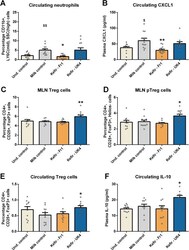 - Fig. 3 UK4 increases Treg cells levels, while Fr1 decreases neutrophil levels. T regulatory cells (CD4+, CD25+, FoxP3+) were assessed in mesenteric lymph nodes (MLNs) ( a ) and were subsequently analysed for Helios expression ( b ), to investigate their origin as Helios+ cells exclusively originate in the thymus. Blood was also assessed for Treg cell levels ( c ), and plasma interleukin 10 (IL-10) levels ( d ). Similarly, neutrophil (CD11b+, LY6C mid , SSC high and CXCL1 levels were also investigated in peripheral blood ( e , f ). All data were normally distributed and analysed using a one-way ANOVA, followed by a Dunnett's post hoc test. Significant differences are depicted as * p < 0.05, ** p < 0.01; milk control compared to Kefir supplementation, $ p < 0.05 and $$ p < 0.01; undisturbed control compared to milk control. All data are expressed as mean +- SEM ( n = 11-12). Dots on each graph represent individual animals