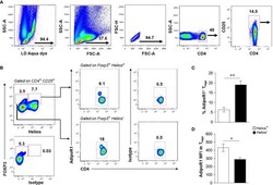 - Figure 1 Human Circulating FOXP3 + Tregs Express AdipoR1. Flow cytometry analysis of AdipoR1 expression in Treg subsets was performed in peripheral whole blood from healthy donors. (A) Gating strategy of human circulating CD4 + CD25 + T cells. Dead cells, positive for LD Aqua dye, were excluded and lymphocytes were gated. CD4 + T cells were gated from single cells (excluding of doublets, FSC-A vs FSC-H) and analyzed for CD25 expression. (B) Helios + and Helios - FOXP3 + Tregs were gated on CD4 + CD25 + cells and then analyzed for AdipoR1 expression. FACS plots are from a representative experiment. (C) Frequency of AdipoR1 + cells and (D) MFI (mean fluorescence intensity) AdipoR1 in Helios + and Helios - FOXP3 + Tregs. Data were obtained from four independent experiments and are shown as the mean +- SEM of n=5. Student's t-test, *P< 0.05 and **P< 0.01 .
