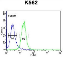 - Flow cytometric analysis of K562 cells using RHBG Antibody (C-term) Cat.-No AP53655PU-N (right histogram) compared to a negative control cell (left histogram). FITC-conjugated goat-anti-rabbit secondary antibodies were used for the analysis.