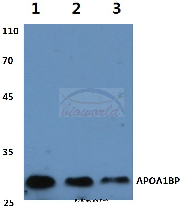 - Western blot (WB) analysis of APOA1BP (F151) pAb at 1:500 dilutionLane1:HEK293T cell lysateLane2:Mouse kidney tissue lysateLane3:Rat kidney tissue lysate