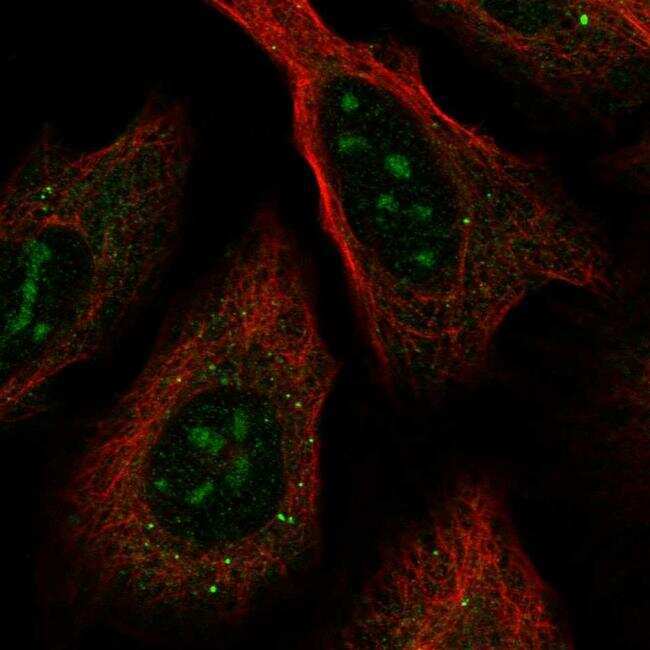 - Immunofluorecent analysis of RRNAD1 in human cell line U-2 OS using RRNAD1 Polyclonal Antibody (Product # PA5-61512). Staining shows localization to nucleoli.