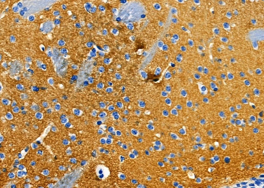 - Immunohistochemistry analysis of OR6N1 in mouse brain tissue. The sample was formaldehyde fixed and a heat mediated antigen retrieval step in citrate buffer was performed. Samples were incubated with OR6N1 polyclonal antibody (Product # PA5-103990) using a dilution of 1:100 (4°C overnight) followed by HRP conjugated anti-Rabbit secondary antibody.