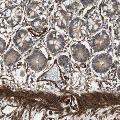 - Immunohistochemical staining of human small intestine shows moderate cytoplasmic positivity in glandular cells and distinct staining of blood vessels and smooth muscle cells.This validation was performed by Protein Atlas and the presentation of data is for informational purposes only.