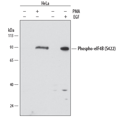 - Detection of Human Phospho-eIF4B (S422) by Western Blot. Western blot shows lysates of HeLa human cervical epithelial carcinoma cell line untreated (-) or treated (+) with 200 nM PMA for 20 minutes or 100 ng/mL Recombinant Human EGF (Catalog # 236-EG) for 5 minutes. PVDF membrane was probed with 1 µg/mL of Rat Anti-Human Phospho-eIF4B (S422) Monoclonal Antibody (Catalog # MAB3800) followed by HRP-conjugated Anti-Rat IgG Secondary Antibody (Catalog # HAF005). A specific band was detected for Phospho-eIF4B (S422) at approximately 93 kDa (as indicated). This experiment was conducted under reducing conditions and using Immunoblot Buffer Group 1.