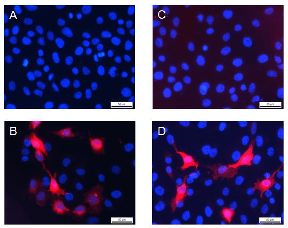 - Immunofluorescence staining of human VEGFR-3/FLT-4 (red) in hFlt4-transfected MG63 cells. Monoclonal mouse anti-human FLT-4 clone 9D9 and polyclonal rabbit anti-human FLT-4 (D) DP3511: A and C are negative control with secondary antibody only; B (mAb) and D (pAb) with specific antibodies against human FLT-4. The experiment was performed by the research group of Dr. Wolfgang Holnthoner, Ludwig Boltzmann Institute for Experimental and Clinical Traumatology, Austrian Cluster for Tissue Regeneration, Donaueschingenstrasse 13, A-1200 Vienna, Austria.