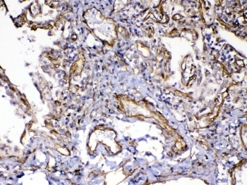 - IHC testing of FFPE human lung cancer tissue with VEGFR3 antibody at 1ug/ml. Required HIER: steam section in pH6 citrate buffer for 20 min and allow to cool prior to testing.