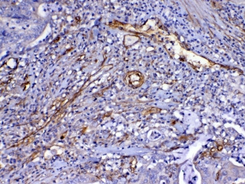 - IHC testing of FFPE human colon cancer tissue with VEGFR3 antibody at 1ug/ml. Required HIER: steam section in pH6 citrate buffer for 20 min and allow to cool prior to testing.