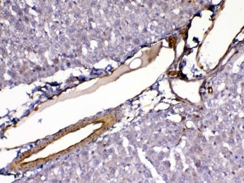 - IHC testing of FFPE mouse liver tissue with VEGFR3 antibody at 1ug/ml. Required HIER: steam section in pH6 citrate buffer for 20 min and allow to cool prior to testing.