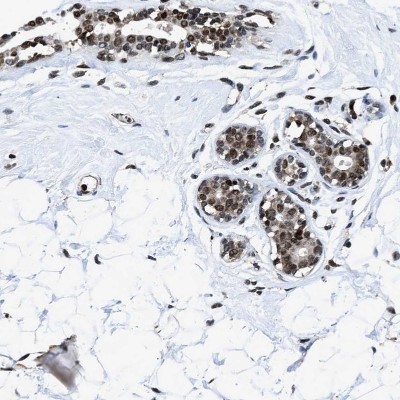 - Immunohistochemistry-Paraffin: hnRNP H2 Antibody [NBP1-89816] - Staining of human breast shows nuclear positivity in glandular cells.