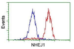 - Flow cytometric analysis of Hela cells, using anti-NHEJ1 antibody (TA502007), (Red), compared to a nonspecific negative control antibody (TA50011), (Blue).